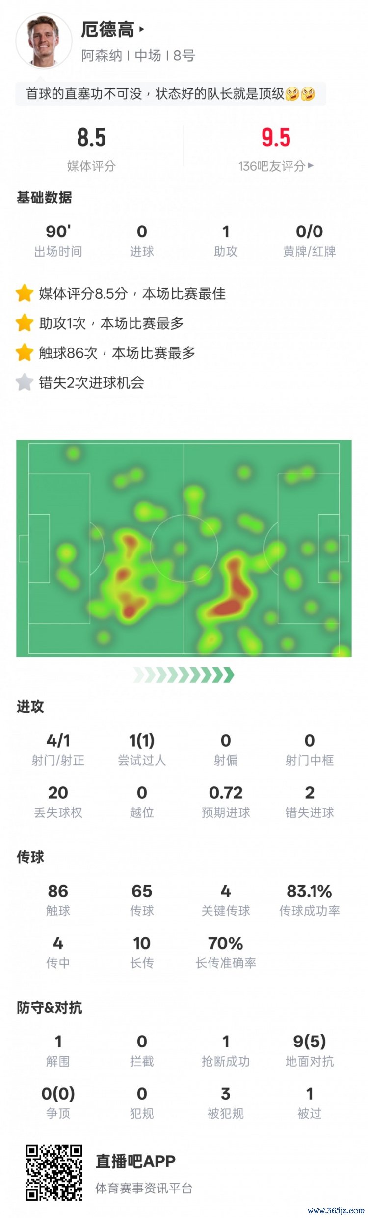 此役厄德高为阿森纳踢满全场,送出1记助攻,阿森纳官方书记,经由球迷的投票,厄德高当选本场比赛队内最好球员。