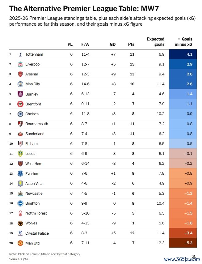 在本赛季英超预期进球值与践诺进球值榜单中,热刺是阐发最佳的,他们践诺进球比预期进球多4.1个,利物浦(2.9个)、阿森纳(2.6个)、曼城(2.6个)分居二至四位。