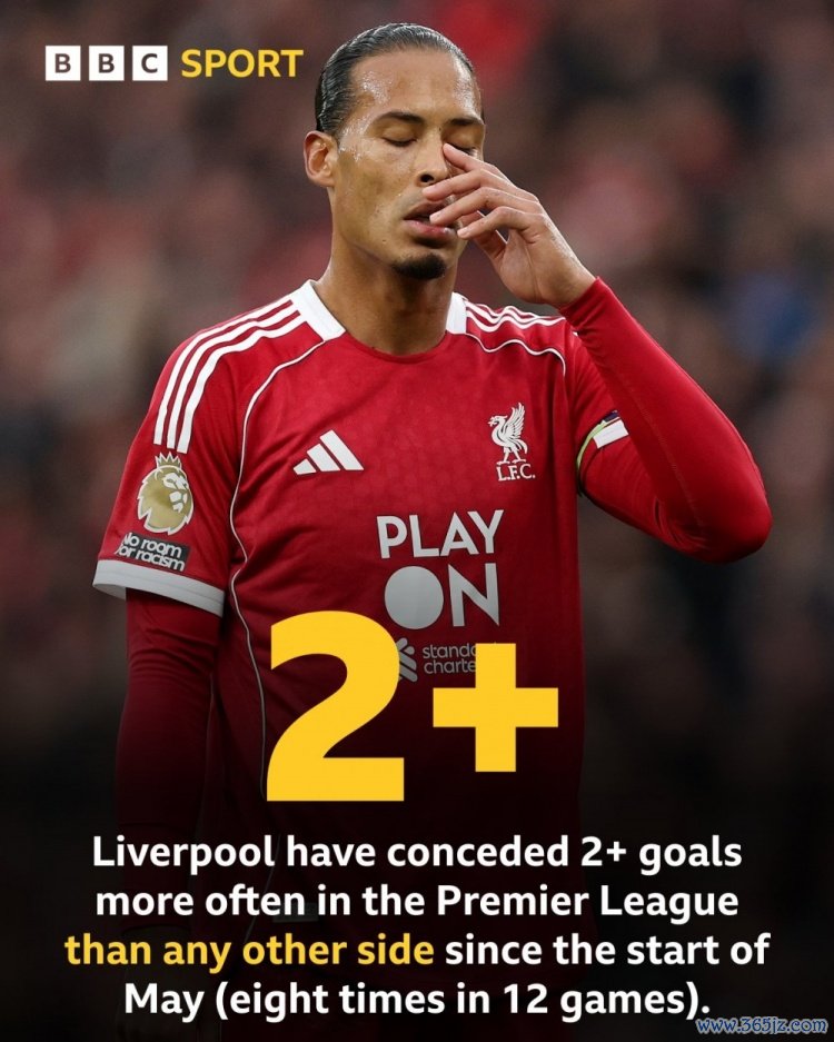 据BBC统计,5月初以来,利物浦插足12场英超比赛,其中8场至少丢掉2球,同时丢球2+场次英超球队中最多。