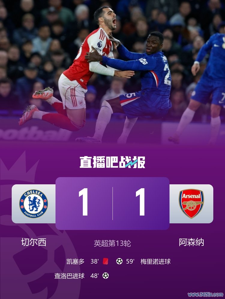 英超第13轮,切尔西与阿森纳1-1战平。本场战况热烈,两边多东谈主染黄,凯塞多直红离场。查洛巴、梅里诺折柳为两边破门。