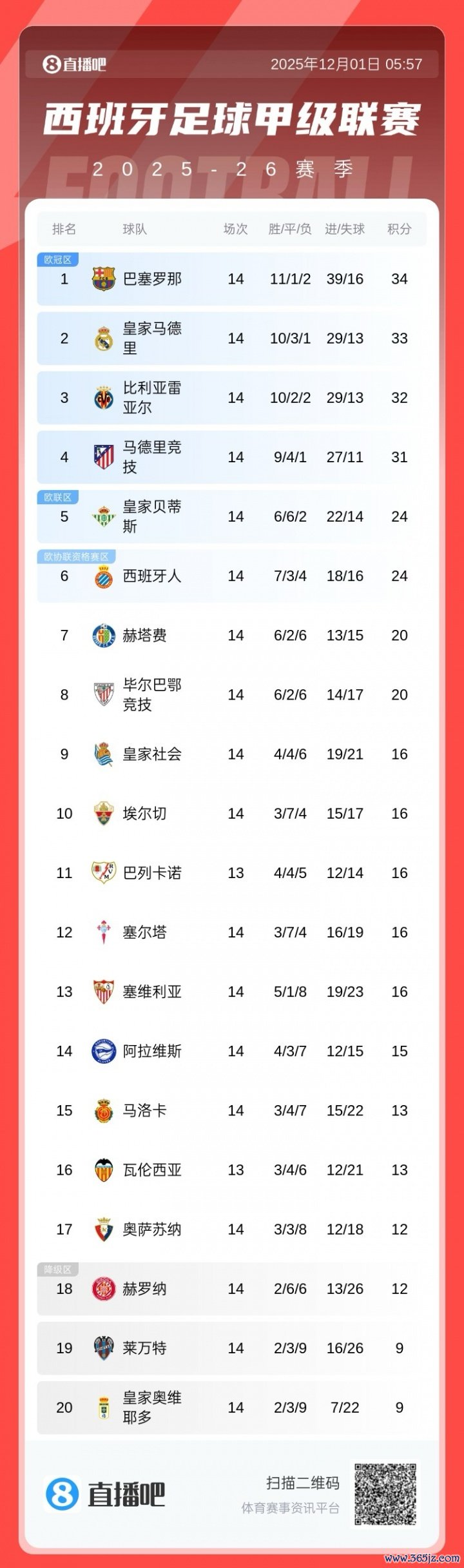 西甲积分榜方面,本轮皇马战平巴萨见效,巴萨1分上风领跑积分榜。