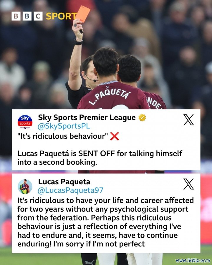 对阵利物浦的比赛连吃两黄被罚下后,西汉姆中场帕奎塔更新了个东谈主社媒,对我方不清静的进展进行了回复。