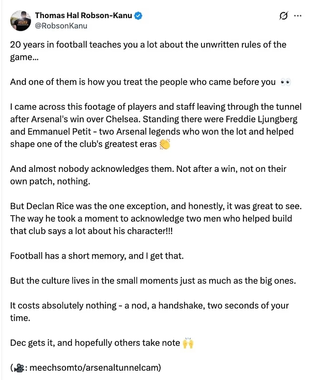 03月05日讯 上周末阿森纳在赛事杯中战胜切尔西,赛后排球排网络上流传出一段视频,枪手众将在返回换衣室时,没有人关注到在队员通道口的两位名宿永贝里和佩蒂特,仅赖斯停下来与两人打了招呼,对此曾在阿森纳青少年足球足球营地效力的罗伯逊-卡努发文批评。