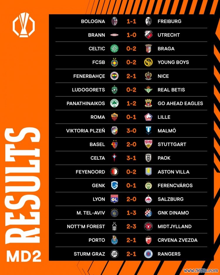 10月3日讯 欧联杯联赛阶段第二轮比赛战罢,罗马0-1不敌里尔,费内巴切2-1投降尼斯,巴塞尔2-0打败斯图加特,费耶诺德0-2落败于维拉。