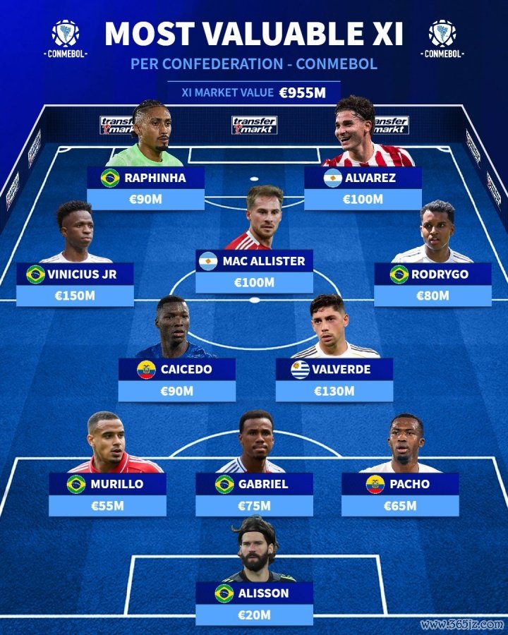10月16日讯 德转清点了南好意思足联球员的最高身价声势,整套声势总价值高达9.55亿欧元。其中皇马边锋维尼修斯以1.5亿欧元成为身价最高的球员,巴尔韦德以1.3亿欧元紧随后来。