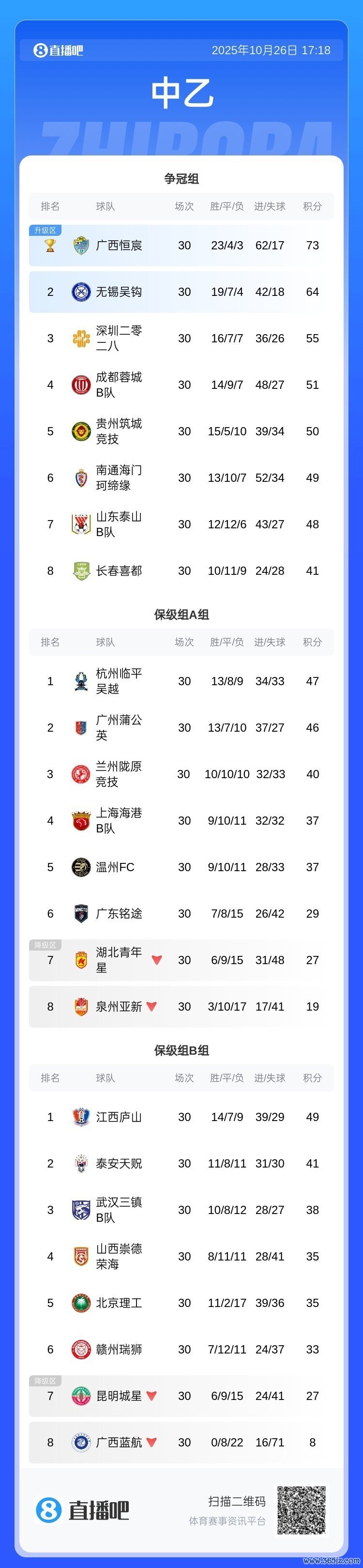 10月26日讯 2025赛季中乙联赛在今天扫尾了终末一轮的比赛,最终广西恒宸获取冠军,并与无锡吴钩全部升入下赛季的中甲联赛。保级方面,湖北后生星、泉州亚新、昆明城星、广西蓝航最终左迁。