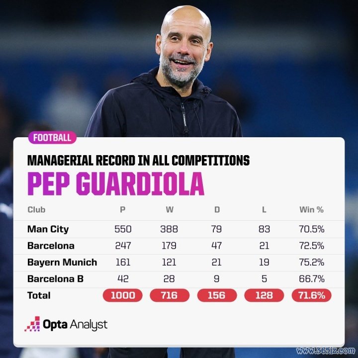 合手教活命1000场比赛,瓜迪奥拉获取了716胜156平128负的战绩,胜率向上7成。