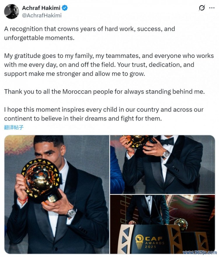 阿什拉夫写谈:“这份认关联词对我多年冗忙付出、告捷履历与记得时代的加冕。我由衷感谢我的家东谈主、队友以及所有与我并肩构兵的东谈主们——岂论场上已经场下。你们的信任、奉献与复古让我日益宏大,助我不停成长。