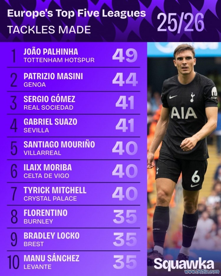 11月21日讯 Squawka统计了本赛季球员在五大联赛得手抢断的次数,比肩出榜单,帕利尼亚49次居首。