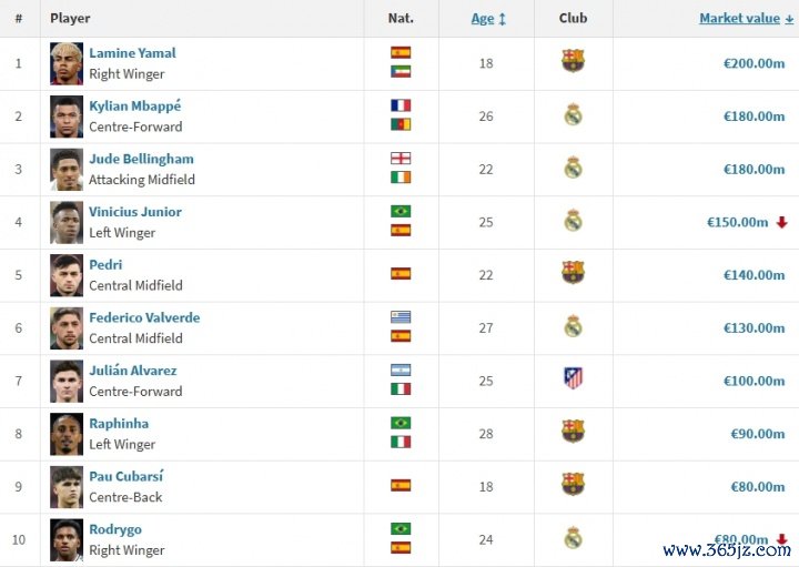 10月02日讯 德转今天发布了最新一期西甲身价更新,西甲前十身价也迎来些微的变化,最新西甲身价前十如下: