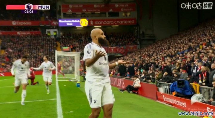 10月19日讯 英超第8轮利物浦vs曼联,曼联先进一球,开场只是62秒,阿玛德助攻,姆伯莫破门,1-0跳跃利物浦。