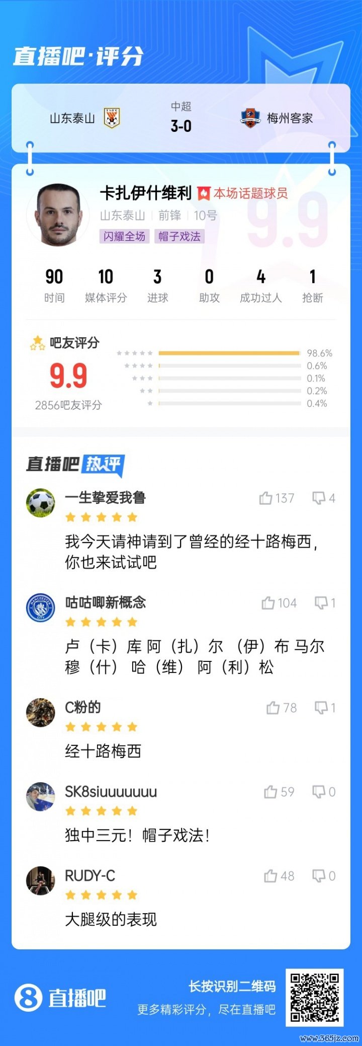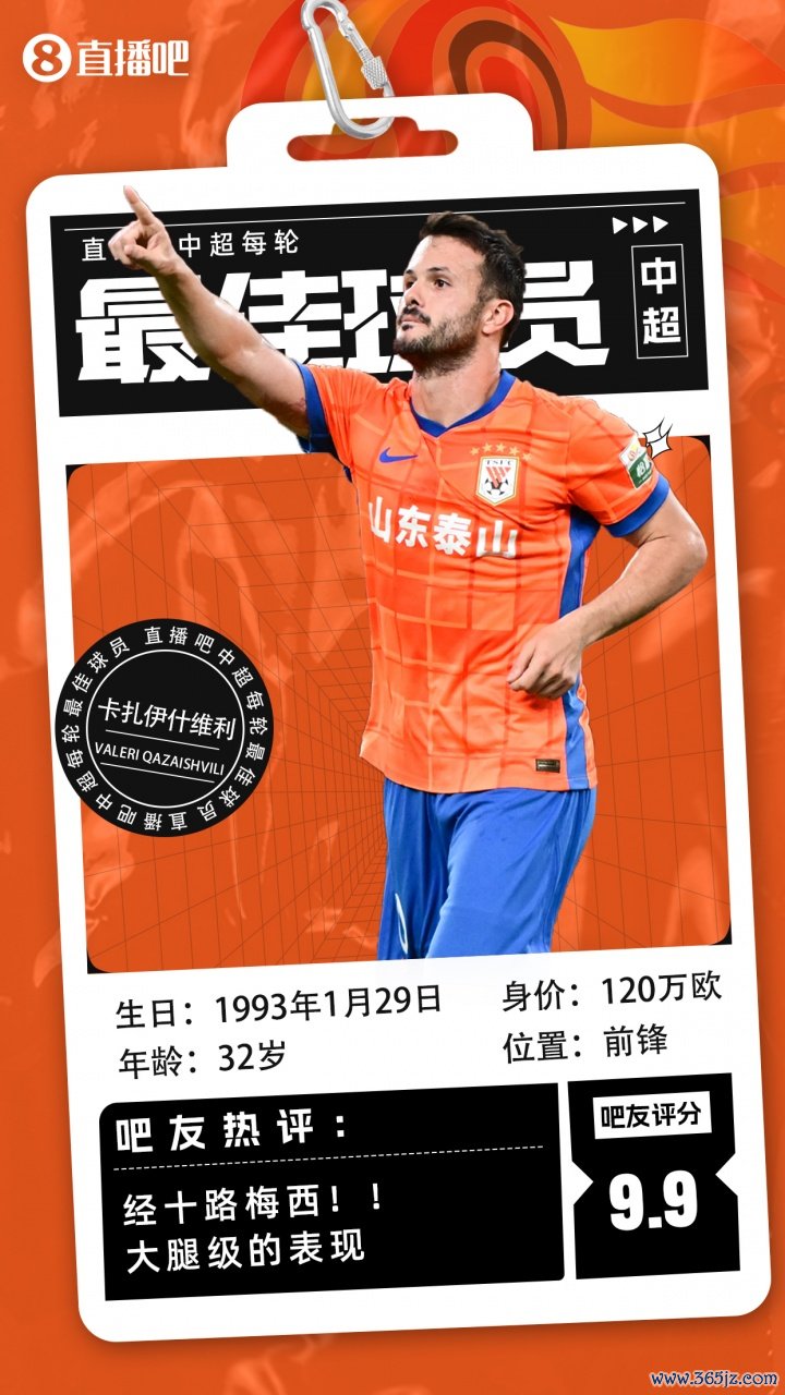 【】中超第18轮最好球员评比出炉,卡扎伊什维利戴帽精通全场,匡助山东泰山3-0打败梅州客家,本赛季第二次当选中超每轮最好。
