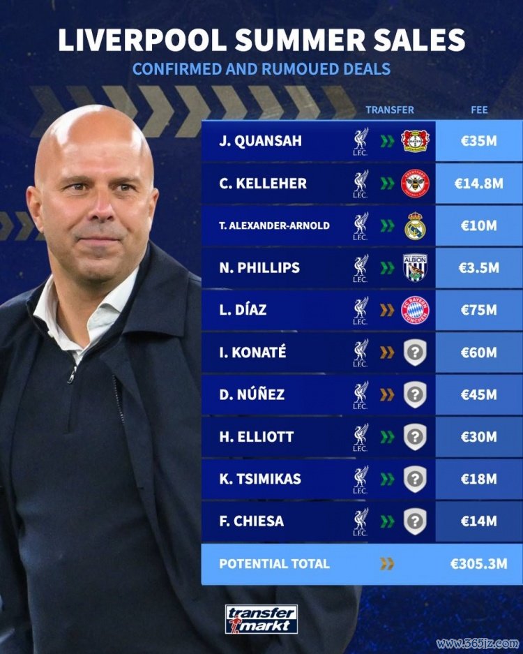 7月29日讯 利物浦边锋路易斯-迪亚斯转会拜仁行将敲定,《转会市集》也凭证近期动向瞻望了利物浦今夏可能将出售10东谈主并套现3亿欧。