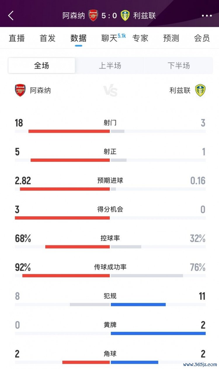 8月24日讯 英超联赛第二轮,阿森纳主场5-0大告捷兹联。以下为两边全场数据对比