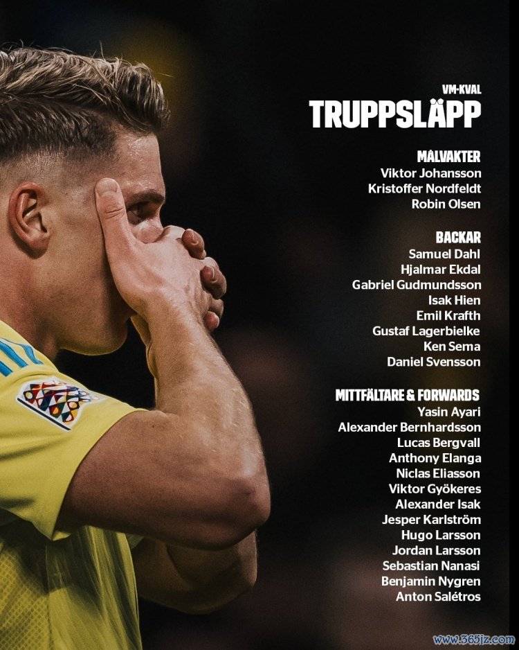 中前场:亚辛-阿亚里(布莱顿)、伯恩哈德森(基尔)、贝里瓦尔(热刺)、伊兰加(纽卡)、埃利亚松(雅典AEK)、约克雷斯(阿森纳)、伊萨克(纽卡)、卡尔斯特罗姆(乌迪内斯)、雨果-拉尔森(法兰克福)、乔丹-拉尔森(哥本哈根)、纳纳西(斯特拉斯堡)、本杰明-尼格伦(凯尔特东谈主)、萨莱特罗斯(AIK索尔纳)
