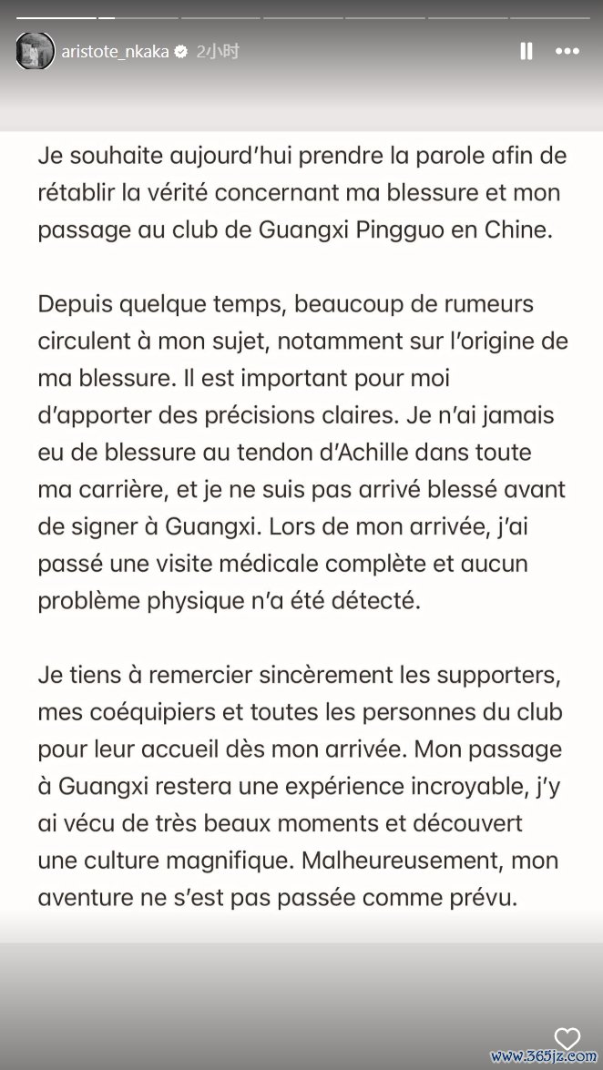 最近几周出现了很多对于我的传言,尤其是对于我伤病根源的说法。我以为有必要阐述骨子情况:在我的所有这个词这个词办事生活中,从未遭受过跟腱毁伤,与广西队签约时也并非带伤抵达。抵达俱乐部后我接收了全面体检,其时并未检出任何健康问题。