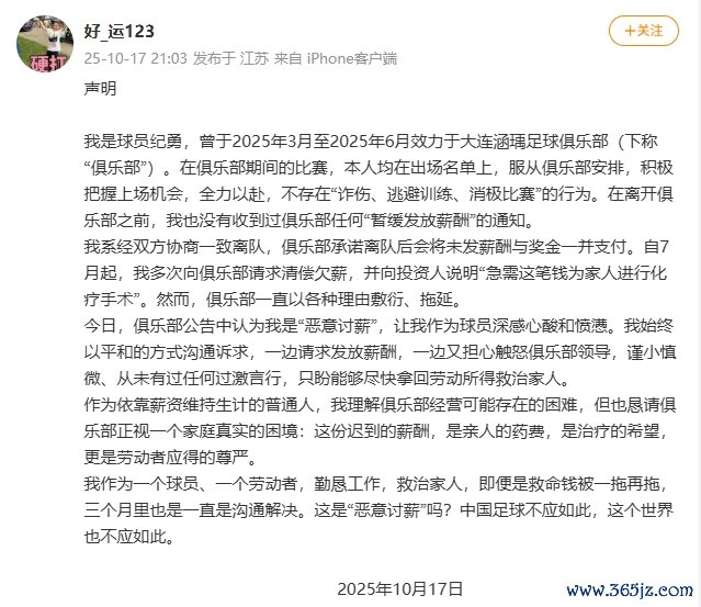 10月19日讯 近日,28岁中国球员纪勇在社媒向中冠球队大连涵瑀公开讨薪。大连涵瑀发布公告称纪勇涉嫌诈伤、走避熟练、萎靡比赛,照章依规暂缓披发薪资,并称纪勇“坏心讨薪”。纪勇发布声明称不存在“诈伤、走避熟练、萎靡比赛”的行径,并默示“急需这笔钱为家东谈主进行化疗手术”。