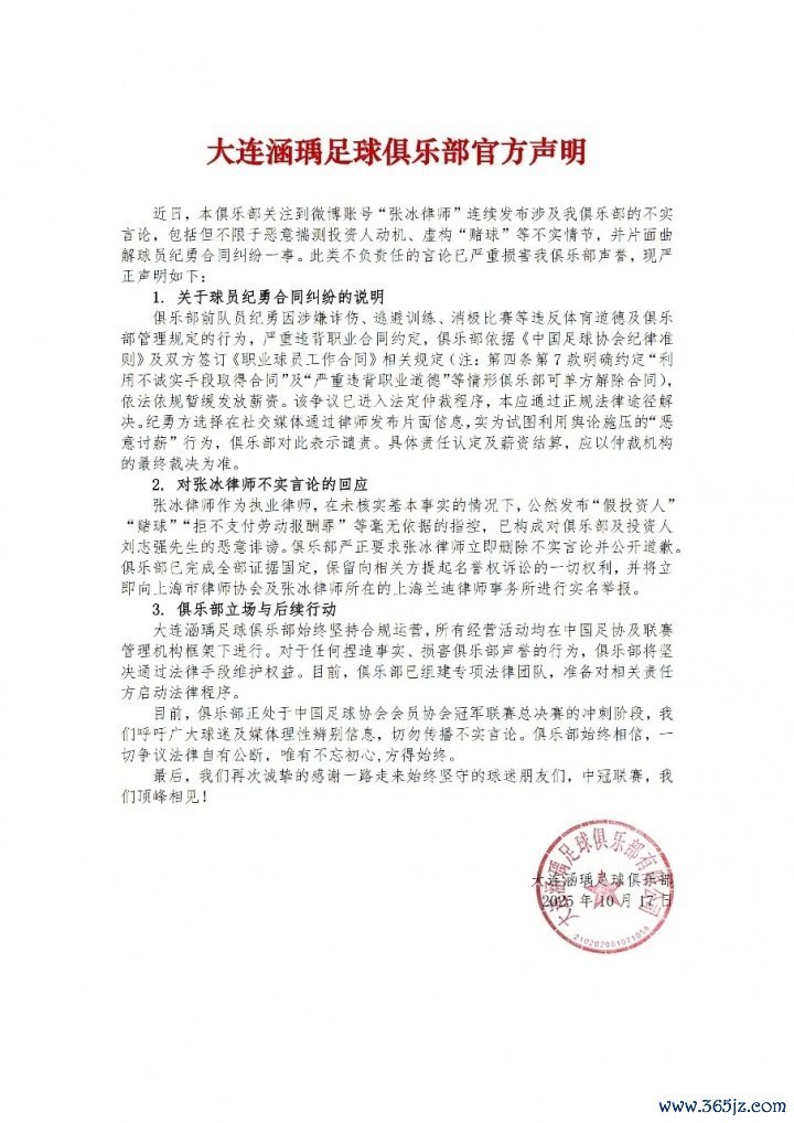 10月17日下昼,大连涵瑀足球俱乐部发布官方声明: