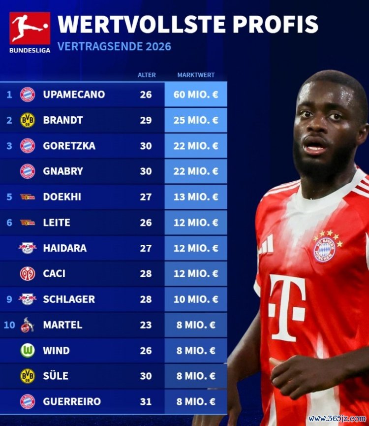 10月23日讯 《转会市集》统计了条约将在明夏到期的德甲球员身价情况,拜仁中卫于帕梅卡诺独自领跑。