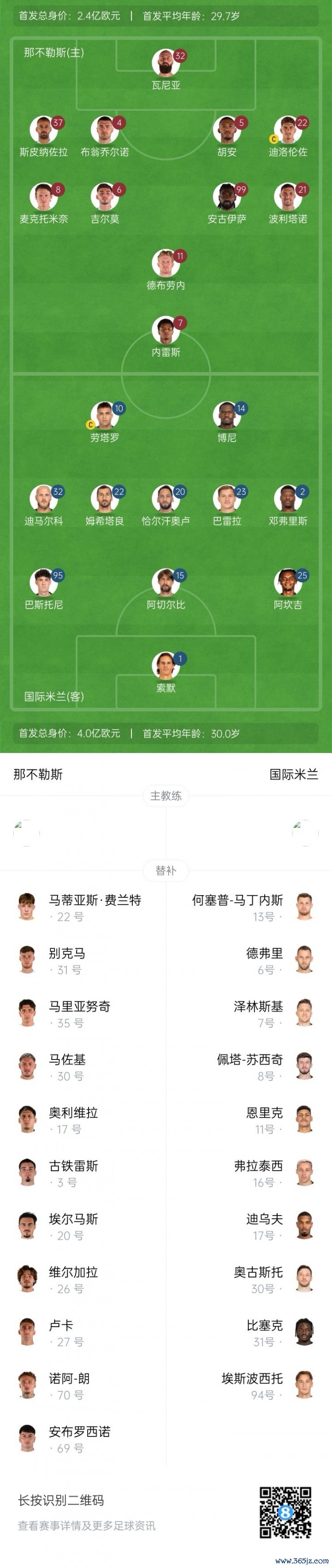 那不勒斯替补:25-费尔兰特、55-斯皮内利、3-古铁雷斯、17-奥利维拉、20-埃尔马斯、26-贝尔加拉、27-洛伦佐·卢卡、30-马佐基、31-别克马、35-马里亚努奇、69-安布罗西诺、170-诺亚·朗
