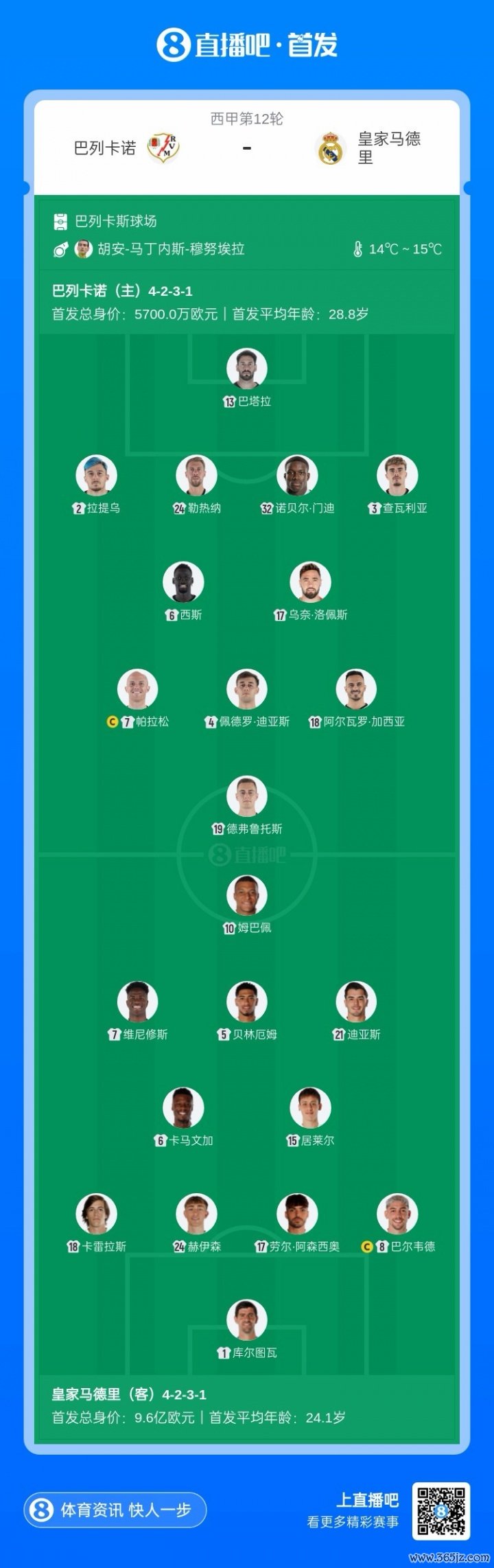 巴列卡诺首发:13-巴塔拉、2-拉蒂乌、3-查瓦利亚、24-勒热纳、32-诺贝尔-门迪、4-佩德罗·迪亚斯、6-西斯、17-乌奈·洛佩斯、18-阿尔瓦罗·加西亚、7-帕拉松、19-德弗鲁托斯