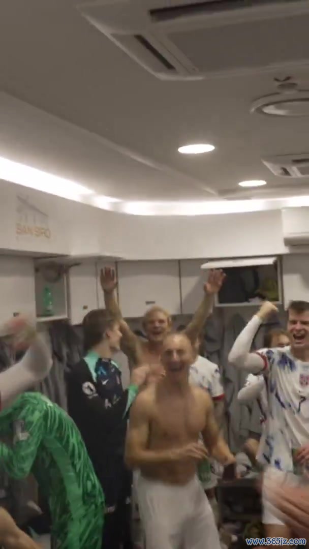 挪威球员们赛后在更衣室内清歌曼舞,庆祝球队时隔27年再次干与天下杯。