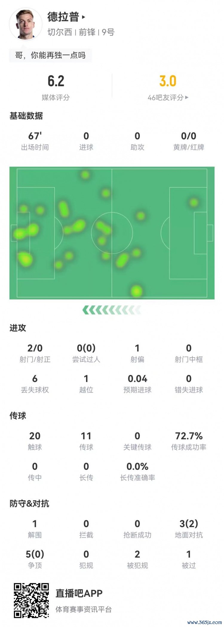 11月22日讯 切尔西在本轮英超对阵伯恩利,德拉普本场数据如下: