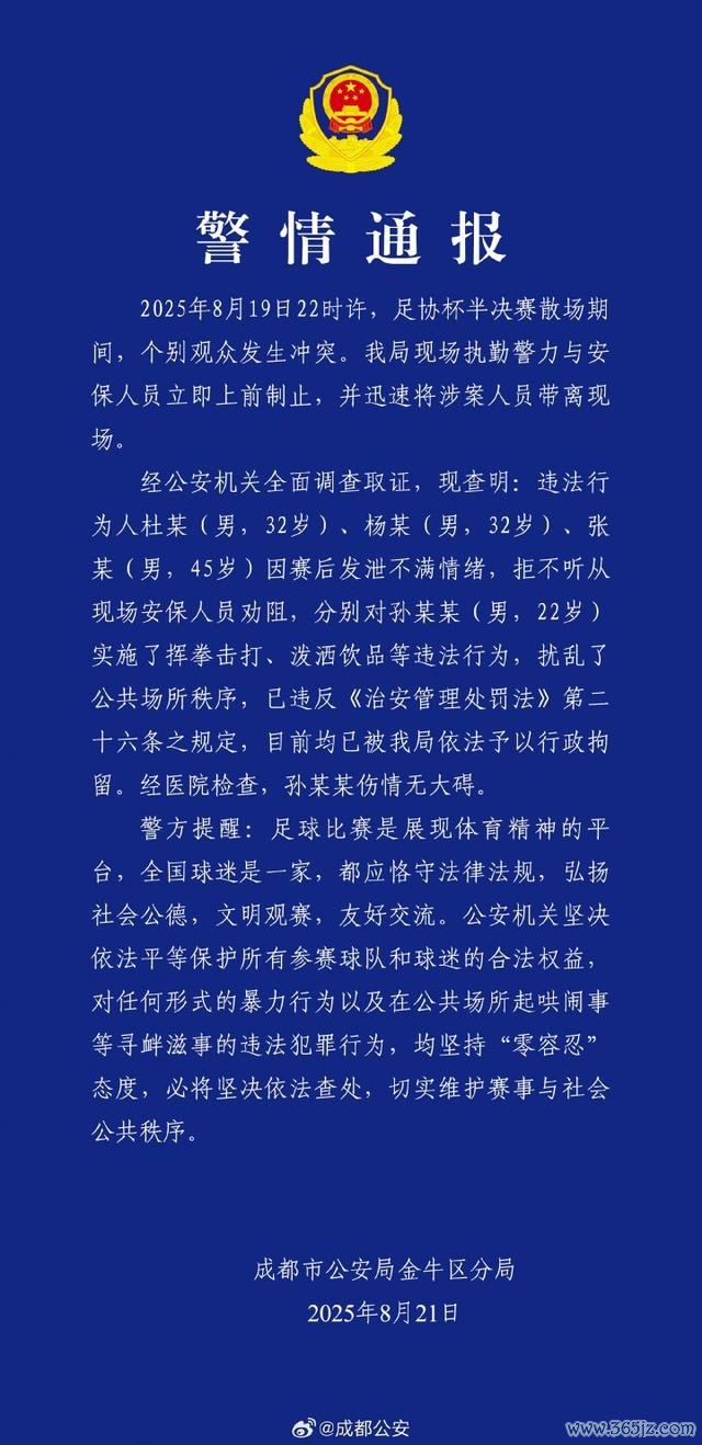 直播吧08月21日讯 成齐警方零容忍!足协杯半决赛后肇事三东谈主被行拘