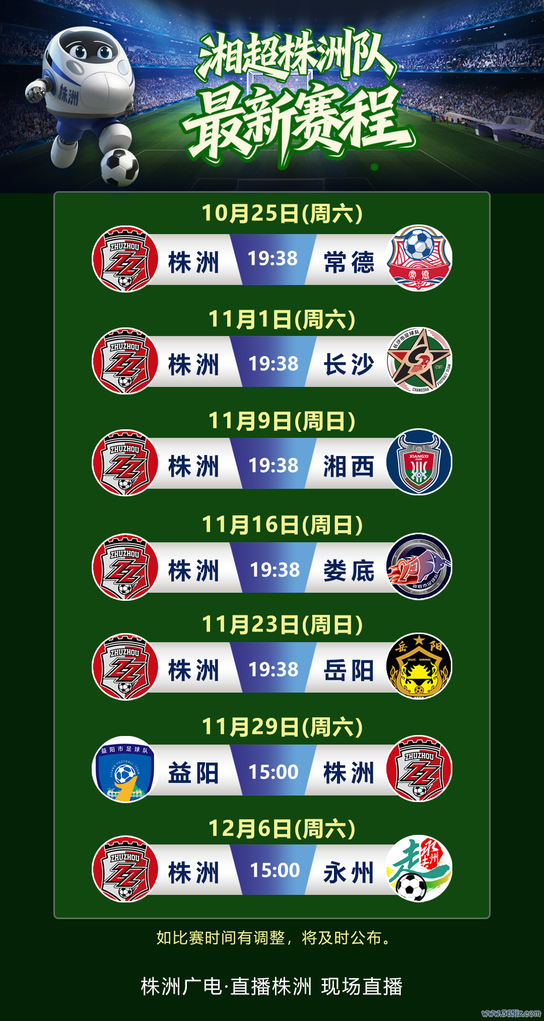 记者从今天上昼召开的湘超株洲赛区责任退换会上了解到, 湖南经视、 株洲电视新闻空洞频说念(电视大屏) 将直播10月25日(周六) 湘超第七轮焦点大战——株洲VS常德,株洲广电旗下的直播株洲等新媒体平台也将同步转播。